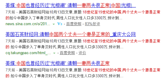10月13日,美国石英财经网站发表文章,大意为:中国历史上也曾出现过光棍潮,当时的解决办法就是几个人合伙娶一个媳妇。