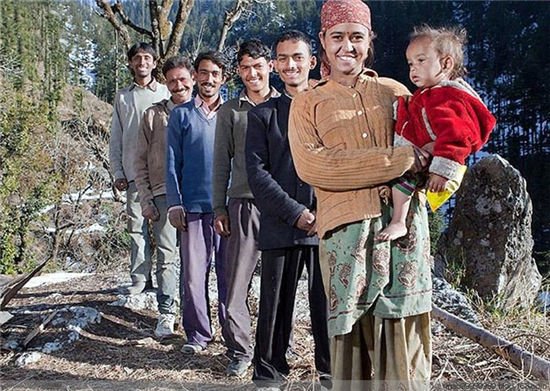 清道光年间的《秦疆治略》记载:“山中多习淫荡,有招夫养夫者……在本夫恬不为怪,而妇女亦甘心允存。”这里讲述的是陕西山阳县,可以看出,当时的读书人把这种一女侍两夫的行为视为“淫荡”。 合娶媳妇并不是什么新鲜事,在一些少数民族地区,甚至有这样的民族传统。兄弟合娶一个媳妇的习俗,至今依然存在。 西藏昌都、四川甘孜、青海玉树和云南迪庆的藏族地区就有这样的习俗。兄弟娶一个妻子,不但家庭财产不分散,而且家里男人多,有的做生意,有的干农活,有的放牧,家里会越来越兴旺,越来越富裕。同时兄弟不分家,亲人团聚,家人和睦相处,再好不过了。丈夫们并没有刻意弄清谁是自己的子女,谁是兄长(或弟弟)的子女。在这样的文化传统中,弄清这一点并不重要。当地社会上对多夫家庭的子女的看法也是“以家为单位的,外人称其子女也是某家的子女,而不是称某人的子女”。 在昌都地区,据色扎部落头人泽丁扎巴的回忆,1959年以前,他所管辖的丁青扎部落约500户,一半都是一妻多夫家庭。1997年,有学者在昌都县妥坝乡(牧区)进行调查,19户家庭里有9家是一妻多夫家庭。 在其他国家也有类似的习俗。 图为印度一妻多夫家庭,五兄弟合伙娶了一个妻子。